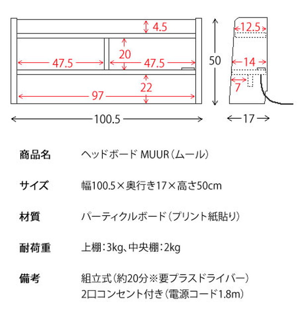 ●商品名ヘッドボード●商品サイズW1005×D170×H500mm●材質パーティクルボード(プリント紙貼り)●塗装ラッカー塗装●耐荷重天板:上棚:約3kg 中央棚:約2kg【代引きについて】こちらの商品は、代引きでの出荷は受け付けておりません。